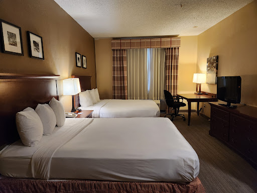 Read moreI wish we would have paid better attention to the reviews before booking. I DO NOT recommend this place. After a 15-hour drive, through the night, we arrived at the hotel at about 6 pm. We traveled with another family who also booked a room here. We checked in and were given room 317. Arriving at the door to the room was the first clue to the type of lodging . The paint on the door was peeling from being painted over and over. There were obvious peeled layers that had just been painted over. We walked in, and the room smelled musty, like stale cigarette smoke. We immediately found stains on the wall, cigarette ash on top of the "clean", made up, bed and there was a hole in the ceiling above the shower. The beds were also very low to the ground and looked lumpy. My husband went and asked for another room. My brother was actually at the front desk when he arrived, asking to be moved because their bathroom door wouldn't close. We were both moved to the 4th floor. That door was fine, but we walked in and found a patch of missing carpet right in front of the door. Our family was being picked up at 7 pm, so we dropped our bags and left in a hurry and didn't look around. When we got back at 11 pm, exhausted and ready to shower and go to bed, we started to notice other things. The carpets (in both rooms) are horribly stained. The second room we were in had missing patches in different places on the carpet. There was hair on the bed, and stains on the wall. We went to my brother's room, and they said they were packing up and going to leave because they saw a roach in the pool area when they took their son swimming. The young lady at the front desk offered to move us again, but by this point, we would rather just sleep on our cars. She very apologetically said she would let housekeeping know and recommended their sister hotel next door. While their issues go way beyond housekeeping, we appreciated her efforts in trying to make things right. I will give her props for her professionalism and efforts, but that is the only positive thing...