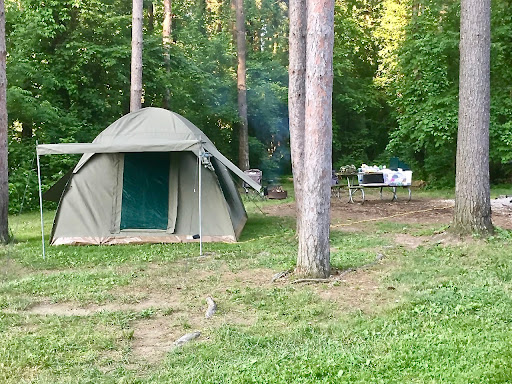Read moreSite 191 is a large corner site, semi level, shaded, with electric, picnic table and fire ring. The site is next to potable water. Prior to our arrival it had rained for days. The far backside, where a tent could normally be placed, had standing water and mushy ground. If you can place a tent here then it would be private. No sites backup to 191 and 190, to the right, is separated by a patch of trees. We opted to come forward and to the left, if looking into the site, of the gravel parking pad. Tall pine trees spaced out perfectly fit our 10X10 tent. We were actually happy with where we placed our tent. We could look out and see passersby, and not be looking at the back of our cargo trailer. After driving through the park and looking at other options site 191 worked great. The clean, spacious bathroom/shower house is less than 50 yards away. One problem, lukewarm water at best. However, my husband said he had hot water. Despite that the ladies have clean showers with good water pressure, large stalls, locking individual doors, a big bench and three hooks in each stall. The laundry was also located at this facility. This is a large campground with only two shower houses. However, other bathroom only facilities are located throughout the park. We heard numerous dogs barking constantly during our visit so pets are allowed. The camp store and science center are nice. Take the time to visit them. We enjoyed our...