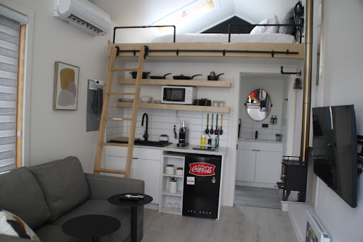 The tiny homes themselves are amazing. Whoever designed and outfitted them has a true gift for design. Every detail, from the full bathroom and compact but fully functional kitchen, to the office space and sleeping area, seems to have been thoughtfully carefully considered. Some highlights were the small "retro" type fridge, the coffee machine, which produced fine espresso, and the impressive cooktop. The downstairs space, which felt quite spacious, had a full sleeper sofa and was very comfortable. The smart glass windows downstairs and in the loft worked well, although they don't fully block the light, and the upper downstairs section had no curtain, letting in a fair amount of nighttime light from the compound.