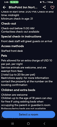 Read moreIf ii could give negative stars I would. As you can see here it says 10 usd for pet fee, that's the online price....you get to the hotel they point at the sign on the counter and said 20. I say how can I see that from 50 miles away booking online? I called asked were they pet friendly he said yes I asked wat deposits do u charge, he said 50 refundable. Never spoke on a non refundable pet deposit. Not a big deal but when I tried to show him wat the website shows, he got crazy and told me he'd just refund my money, the policy is on the counter in the lobby, I ask how can I see that booking online from 70miles away. Rude, loud and very arrogant. Then at 10:25pm i hear verious very loud voices outside, its the desk attendant with about 6-8 of his friends in the parking lot having a grand ol time. Im only passing through for work, so i have to get up at 5am. Not knowing it was him, i had to step out my door and ask them to keep it down finally at 10:50pm, about 20 min later they dispersed. I wouldn't send my dog to stay in this filthy roach infested motel. With a place like this, one would think their customer service would be better. I'd sleep in my car before spending money here! A hotel that the mgr doesn't respect their guests, doesn't honor their website or respect quiet hrs after 10pm. If I wasn't working, I'd never in a million years stay at a place this bad. There's other hotels in the immediate area....use those, worst service and staff I've ever encountered in the continental 48. This visit was on 9/9/2024 and gets a -10 out of 5 stars. Just horrible. Attached is the online pet policy the guy refused to...