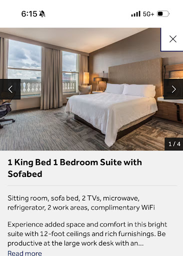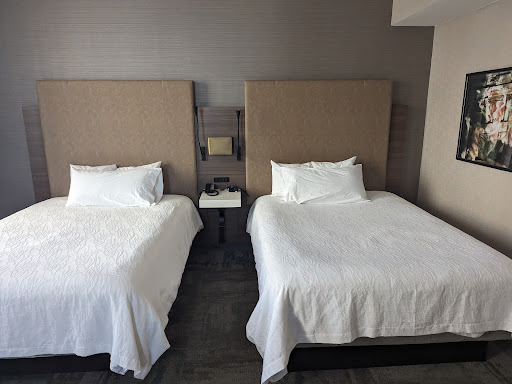 Pros: Location: This hotel is less than 0.1 miles from the Soldiers & Sailors Monument, which acts as the center of downtown Indianapolis. As such, it was super convenient to walk to all the major tourist destinations (except the zoo) in downtown Indianapolis. It is a bit further from the conference center compared to most hotels in downtown Indianapolis. Room Size: The 2 queen bed 1 bedroom suite is 700 sq. ft, which appears to be one of the largest rooms available in a Hilton-branded hotel from what I can tell (not including any of the super lavish rooms available in the Hilton or Conrad). The typical rooms are 400 sq. ft, which is pretty standard (the Hilton and Conrad appear to be slightly bigger, while the Embassy is about the same). When I booked this room, the suite was only ~$20 more than the standard 2 double room, and was well worth it. The room view isn't that great but it does give you unobstructed views on the north, and obstructed views of the east and west sides (you will not be able to see the Monument from the west side though). Bathroom is decent sized and the toilet has a separate door. Condition: This hotel was last renovated in 2018, and appears to still be in great condition. Everything except for a single lightbulb appeared to be working, and the bedside table and desk all had plenty of regular outlets and USB ports for charging. The room has central air (no PTAC!), and lots of storage and seating. The lobby and hallways also looked to be in good condition. Sound isolation between floors and between rooms appear solid, but I don't think the hotel was particularly busy.