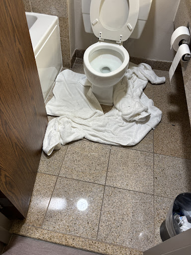 My room was fine-ish. Clean enough, albeit dates and really lacking in detail. No battery cover on remote. No hair dryer. Stained toilet seat. One tiny soap. Guest chairs heavily stained. Two of the three lamps didn’t work. I stepped on a pushpin, but it was on its side. There was a $5 bill tucked into the coffee service, indicating that it might have been a while since it was wiped down or dates checked.