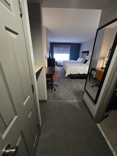 However, I booked on-line with an Holiday Inn Express Customer Care rep specifically asking for a reservation in the Jacksonville area with an indoor pool. Staying in January I knew it wouldn't be super warm outside and one of the requirements of my family staying somewhere is having an indoor pool for my children. The website is very misleading it says there is an indoor and an outdoor pool. The pool is indoor - well half of it and the other half is outside. When the temperature is 48 degrees at night swimming isn't really an option in a pool that is exposed to outside temperatures. The fans on the indoor side were running non-stop to make it even colder to make for a very unpleasant experience, they never restocked the pool towels the entire time we were there and the lights in the pool area did not come on until it got dark outside. I would never have stayed there had I known the pool wasn't inside.