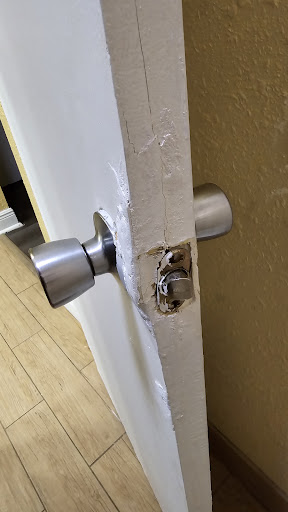 I have never stayed in a cobbled together piece of garbage hotel room like these...ever. These standards were not even what I would consider sub-par. Pathetic. Do NOT waste your money or your time. These aren't even the rooms to think to yourself: "hmmm, we only need a bed for the night". Your car is 1000 times better...trust me. The dumpster on site is even better. I didn't get a picture of the first bed because I had no idea what trouble we were getting into. But as you can see the other door knob is jacked up and that hole in the wall from...