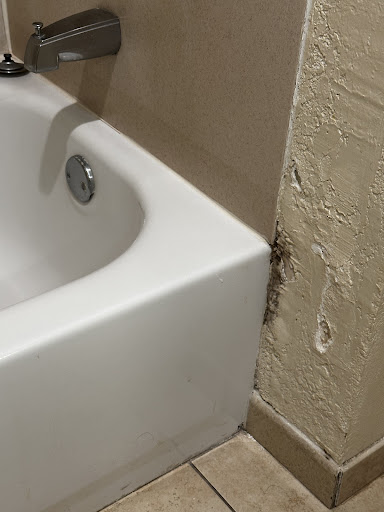 Disgusting unclean bathroom and tub. Sunken in bed. You could feel the springs. Small outdated TV “which wasn't a big deal”. A broken closet handle that just spins. Stains on the carpet even though it was “just cleaned.” Damaged doors. Mildew carpet from bathroom flooding. The carpet area in the bedroom area was dry. Stains on the walls. Broken night stand.