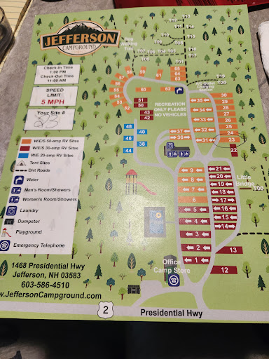 We had a great visit with our family to Jefferson Campground! As a tent camper I was initially a bit nervous about the quantity of RVs but but the tents are in a different area of the park which is pleasantly wooded and really beautiful. Picture attached is the lot across from ours (T13).||||Apparently the campground is under reasonably new owners who took over just before COVID and have some big dreams for the place, including adding a bathroom closer to the tent campsites and adding a group campsite.||||Pros:||-Stunning fall colors and tree cover ||-Decently sized campsites with variety of landscapes (more wooded vs more open) and good privacy ||-Easy 30 min drive to Mt Washington||-Potable water station was noticeably delicious (really, the water was super fresh and good tasting)||-Bathrooms are sparkling clean and they even have showers (and laundry service!)||-Owners are delightful. They delivered our firewood to us and brought us a free package of s'mores.||-Easy check-in experience; done entirely online before we arrived so we could go straight to our tent; check out was even simpler!||||Cons:||-Definitely check the restricted dog breeds list. Our German Shepherd mix was restricted and we had to find last minute dog care.||-Only one of the fire pits had a grill||-Wood purchased on site was a bit damp||-Bathrooms were a bit far from campsites (see comment above that they want to add another one)||-Wifi doesn't stretch to the last campsite, playground and pool are old (but look, we're camping here so if you're coming for these amenities look elsewhere)||||Ultimately we are really excited to see how this campground improves over the years. The new owners are very enthusiastic and have some great ideas and we are thrilled about what they'll drum up!||||Thanks for a wonderful...