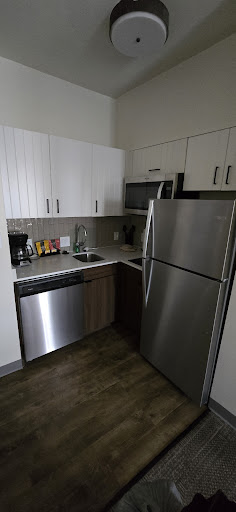 The kitchen in the room has a full-sized dishwasher, good size sink, a glass electric stove top, and the largest microwave I've seen in a hotel room (Whirlpool WMHH31017HS09 which is 1.7 cu feet, 1000w) with a built-in range hood. The fridge is a full size Whirlpool with a proper freezer. They also have dishwashing tablets under the sink so you can wash your own dishes.