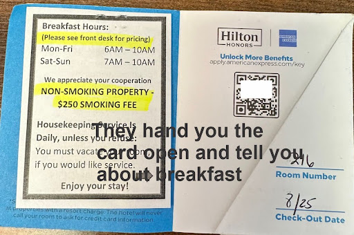 So, I took the keycard envelope and looked at the other side. Behold, on the other side a piece of paper stating, “Please Note, our hotel is under construction”. I asked why didn’t you tell us verbally about the construction noise starting in the morning instead of hiding it on the keycard envelope when checking in? She said it was my responsibility to review everything on the keycard envelope and it’s our fault for not reading it. I can see why they handed you the keycard envelope open so you would not read the note about the construction. Good trick. Who reads everything on keycard envelopes? They usually end up in the trash.