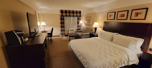 Read moreI don't even know where to begin. Every Hiday Inn I have ever stayed at offers a free breakfast in the morning. Your location does not. As a family of 6, this is an amenity we were counting on. Since you don't offer a breakfast, we went to the restaurant to buy one. We sat, and sat, and sat...no waitress ever came. 45 minutes. Not a single person working in the restaurant came over to help us. Forcing myself and my kids to eat a $10 a plate buffet breakfast. Even though we had items picked off the menu we wanted to order. It was only after my husband got up and tracked down someone to help us, that we got any service. And at that point all she did was bring water, since we hadn't been helped and none of us had anything to drink with our $10 buffet. And the food? It was gross. I figured since we were expected to pay $10 and the meal was in your restaurant, the food would at least be restarunt quality. Not so much. The eggs were gritty and cold. The potatoes were soggy and cold. The pancakes were oddly flavored and cold. Needless to say, my kids barely touched their $10 breakfast. My bill came to almost $50 for food no one ate. Not to mention the horrible service. We went to the pool four or five times during our stay, never, not once were there pool towels stocked in the pool area. Not once. We either had to use towels from our room, or remember to ask the front desk for towels on our way to the pool. Given the traffic going thru your hotel this particular weekend, one would assume you would keep pool towels in the pool area for your guests to use. Also, our room never got cleaned during our stay. We had to track down a member of housekeeping just to get fresh towels. Another time we asked if our room could be cleaned while we were out, she said it wasn't on her particular list, but would get it cleaned by someone. Well, that never happened. With 6 people, 4 of whom are kids, in one room, it definitely needed cleaned. But that didn't happen either.