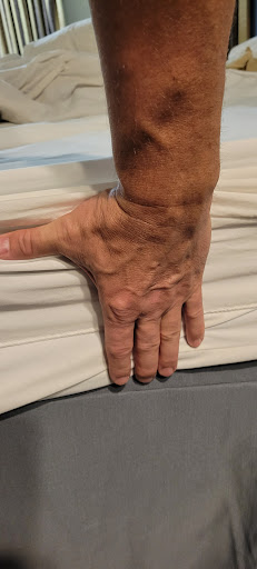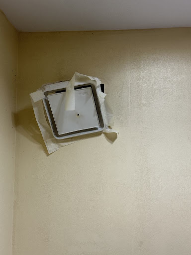 I thought at least now we would get a room away from the blowing wind tunnel, but, no, we were placed in the room right next to it. We could hear the fan in our room. The next thing I noticed was the exhaust fan in the bathroom hanging out of the wall by its wires. Then there was the wall protector that was pulled out of the wall hanging by the screw. Next was the torn bed skirt and the broken table lamp. Then we got in bed. The mattress was so worn out, that it sunk in the middle on both sides. It was like sleeping in a hammock.