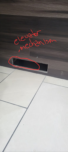 Most concerning of all was the condition of the elevator, which appeared to be unsafe. There were exposed vents without protective grates; if someone were to accidentally place their hand or foot inside, it could become caught in the elevator mechanism, potentially leading to serious or even fatal injuries.
