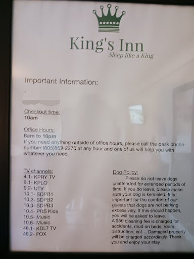 I have to say that over the years I have stayed in a lot of hotels and motels across the country. the big problem with all of them are the outlandish rates they charge and they get away with that. They are run by some big corporation , no personal touch. Well I had a pleasant surprise this week I was on a hunting trip and decided to stay at the" KINGS INN" in Kennebec South Dakota. Briefly I have to say that it Is owned and operated by very friendly and accommodating family . The motel is in a quiet location , the rooms are very clean and comfortable almost made me feel like I was home. I am looking forward to staying there again when we come back to the area to hunt . The number one factor beside what I have mentioned so far is the EXTREMELY REASONABLE RATES.That is something you just can't find any more when you have to stay overnight while on the go. Its a pretty nice place to stay and I highly recommend staying there as I surely plan on staying there when ever I am in...