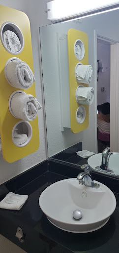 This Motel 6 is celan but very no-frills even by Motel 6 standards; the room I had is best described as spartan. I did notice a bent towel rod in the small bathroom, which had only a shower stall and a toilet and sink; the shower itself was cleaned well, but had not been given a finish coat of pain.