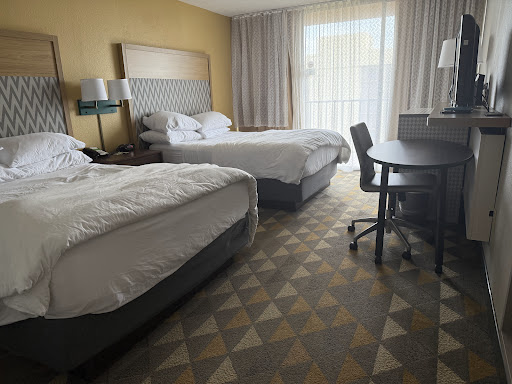 We used booking.com to secure our reservation. This hotel is centrally located. If you're going to Disney, Universal, visiting family, or going to the Mecum Auto Auction, as we were, it's a solid choice. The lobby was bustling when we arrived on a Friday night about 10 pm. The room on the second floor was as quiet as could be. The room is slightly dated. They still have carpet in the room. Alot of updated hotels have moved to LVP flooring. Our room had two queen beds. The air conditioning unit underneath the window was loud. We just had to turn it off to sleep. The room has all the amenities one would need, including small refrigerator, microwave oven, keurig coffee machine with coffee and tea pods, hairdryer, and dispensers at sink and in bathtub with Dove products. The bathroom was spacious, but there isn't a separate toilet and shower area from the vanity. The room appeared to be clean and orderly. There was a small balcony with two chairs, although we didn't go outside. It overlooked the parking area in the rear of the property and it was raining.