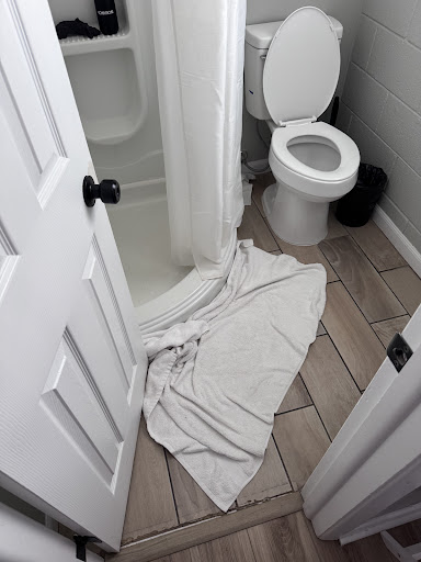 Once we got inside, at a glance the room wasn’t bad…especially for one night. Within 10 minutes of being in the room a breaker tripped and we lost power to half the room. Once we overcame that minor hurdle, we started to get ready for dinner which led us to the shower to get cleaned up. The shower head was janky and barely fixed to the wall. The curtain didn’t keep water inside the shower (take not of the towels on the floor near the shower). The towels were the only way to keep from flooding the bathroom. Before anyone reading this says that all we had to do was close the shower curtain. I wanna make it known that while I was showering my wife was holding the curtain closed and it was doing no good. As I was brushing my teeth, I noticed a small smudge of a red liquid on the wall by the sink that appears to be blood and small smudge of the same stuff on the shower curtain. Also, you’ll notice the bathroom vent has a beard. That’s nice.