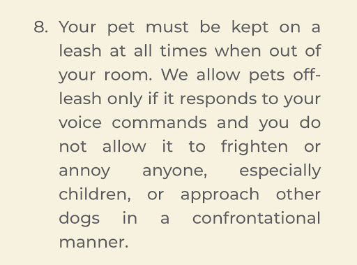 My dog was briefly off-leash because the resort’s own policy says off-leash is allowed if the dog listens to commands, and mine absolutely does. However, the woman told me it’s against city ordinance and must be leashed at all times. That’s fine, but then the resort policy needs to reflect that. As a visitor, I follow the resort's rules, not local laws I’m unaware of.