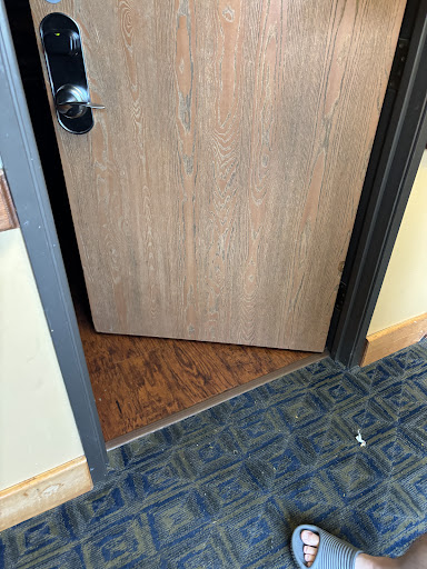 There were bits of trash scattered on the floors, dirty carpets, and very stinky. The ice maker positioned on the landing of the stairs had visible leaks and mold. Trash was on the floor right outside of our room, and the inside of the room didn’t get much better. It was very basic and bare, but the closer you looked the more fault you found. Pillows were dingy, leaning against the wall on the decal headboards. The door to the outside hall had a large gap, a lightbulb was burned out in the room, and there was what looked like mold/mildew above the towel rack and extra toilet paper in the bathroom. The toilet was obviously leaky and the vent had dust accumulated. There were burn marks on the laminate flooring; a testament to past tenants smoking in the room.
