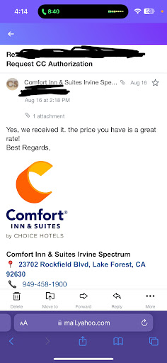 Not to mention it's my fiance's birthday tomorrow and I'd like to celebrate without any issues But so far so good... They had no problem checking us in Late and understood the rules of no charge for a registered service animal, although they ARE pet friendly and the additional pet fee is around $35 for those of you who have pets ... I called ahead and told them we couldn't get there til after midnight... No problem, they said... A family member used their Choice Hotel points to book this reservation and ahead of time asked to put the incidentals/deposit on his Credit Card, even though he would not be present.... They emailed him a simple form to fill out with copies of the credit card and his ID. I like that they would only send this to the choice hotel members registered email address to protect from fraud. When I checked in, they DID ask me for a credit card, however I Pointed out one was sent, and he said he received this and had printed copies of š³ CC and š , and they did, ultimately use that card and did not require me to give an additional card. The rooms seem to all or most have an accessable balcony. The chair in our room had some minor tears in it, plus a dozen or so dead insect š carcasses on the balcony š¤¢gross, but other than that room is nicely kept. Large bathroom, good š„ hot water and good water pressureš¦