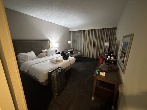 The room was okay. The king suite is an odd layout with a bed on one side and the couch on the other with a swivel TV on a desk in the middle. So you can only watch TV from one side of the room. The wall was covered with curtains but it had only one small window. As a result the room was very dark. The desk chair was yellow fabric and absolutely disgusting with black stains all over the seat. It made me grateful the couch was grey but also scared for what stains the color was hiding. The fridge barely got cold and I couldn't find a way to adjust it. No extra toilet paper in the room. No luggage rack provided for suitcases. Nightlight in the bathroom didn't work. Internet was slow.