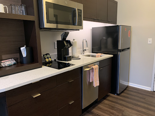 This is our first night here, we arrived late. The front desk person was really awesome, offered us great customer service, and was really helpful! I was so surprised to walk into our room to see how beautiful it is! I absolutely love the decor and the design of our room is functional and beautiful. Beautiful colors, lots of space, lots of storage place, full kitchen, with gorgeous counter tops! It has a stove, oven, large fridge, dishwasher, and a big microwave, and the kitchen is fully equipped with dishes and cooking ware. We're in a one bedroom studio, the bedroom is completely separate from the living room. It has 2 huge tvs. A nice office area and a large beautiful restroom with the same beautiful counter tops. I'm actually in love with this room. Lol.. We travel a lot and we have stayed at a lot of hotels but I have to say, when it comes to the color scheme and the design of this room this is the best I've seen. To top it off, this room is just so cozy and comfortable! I'm glad we decided to stay here. The whole hotel is beautiful inside and outside! I can't wait to go explore it tomorrow. I'm excited to try the breakfast and can't wait to check out the pool and fitness room! I haven't had a chance to explore the area, so I'm not sure yet if what there is to do around here. I'll post more later after our stay. ADD ON: Beakfast is fresh and delicious! 2 big and clean laundry rooms 1st floor and 3rd floor. The fitness room is one of the bigger ones i have seen and clean. The location is okay. there are lots of restaurants and stores nearby. Not the greatest windows views, but that's okay! The indoor pool is nice, but it's cold, we were hoping for a heated pool since it's winter. I think it's awesome that we can borrow kitchen appliances and games! This hotel pays attention to the small details that really made our stay...