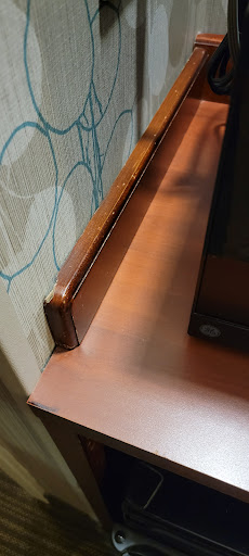 The next time I stayed there I received the renovation notice once again (this trip was about six months later) but didn't see anything besides some exterior painting going on. Immediately after walking into the room a subtle odor of mold and urine hit me. It wasn't terrible, but it was noticeable. I also noticed (as shown in the attached photos) that much of the furniture in the room was broken, damaged, or dirty. Because I am not one to complain, I didn't say anything at the time. After returning from a business meeting later that night I was getting ready for bed and realized that the air conditioner was broken and didn't work. Since it was late at night and I was tired, I didn't want to go through the hassle of getting move to a new room, because it was only slightly warm in the room but bearable. In the morning, I was woken up to the sound of water flowing from what I thought was the shower head. After a couple of minutes of the noise, I investigated what might be causing it and found water pouring out of the light fixtures in the ceiling and flooding the floor. I immediately checked out and asked to speak with a manager and I was told one who had the authority to do something would be in later today and would call me.