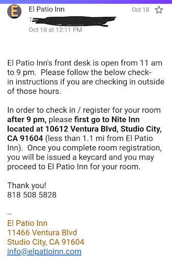 El Patio Inn is in the perfect spot and theyâre banking on it. I reserved the room about 2 months in advance. I received a voicemail the week before I arrived, asking to confirm my arrival time (they donât have front desk after 9pm) and informing me of a pre-authorization charge on my card. Sure, despite me planning to arrive at 4pm, I called them back.