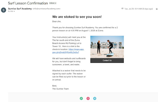 Sunrise Surf Academy is truly magical. Our son has been surfing with them for years, and what started as zero experience has turned into real confidence and skill in the water. He’s grown so much—not just as a surfer, but in his independence and connection with the ocean.