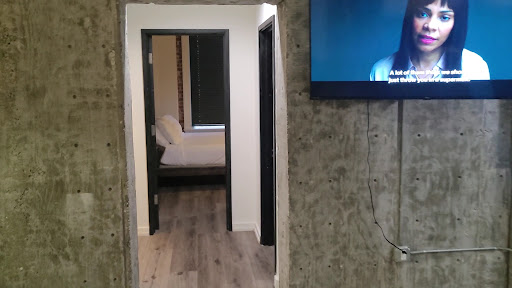 ââââââ The Room Have to break the clean seal to enter the room. Was very spacious and clean. As soon as you walk in on the left there is a place to put your shoes, coats and suitcases. To the right is a full kitchen. When you walk a little further into the room just past the wall partition, there's a queen bed, end table, and a twin bed. In the middle of the room was the living space with 2 couches, one with a pull out bed. 65' TV on the wall. In front of the kitchen is a dining table with four chairs. As you walk past the TV, you walk into a little hallway to your left. There's a walk-in closet with ironing board & iron, and plenty of storage shelves. To your right is the bathroom. Then you enter the bedroom with a queen bed and 65' TV on the wall. There's an end table next to the bed with plenty of sockets to plug your electronics into.