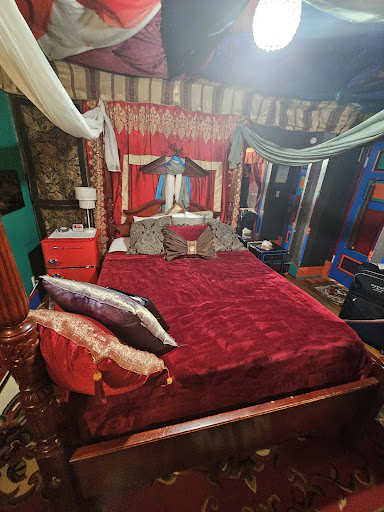 I will admit, first impression wasn't the most positive. I kept thinking "What did I get myself into?" It didn't take long for it to grow on me though. For starters, at the price The Oasis charges, you could stay at some of the sketchiest, most run down places in town. We are talking places that you see in movies where someone stays when they are fleeing from the law. Places that probably have a chalk outline in the carpet from the previous guests. Or, you can stay at a Motel 6 or something like that for almost twoce the price. Or, you can stay ar The Oasis. That's basically why I booked. Anyway, as i settled in, I realized I was staying in a charmingly quickly place that was more of an experience than a room. I stayed in "The Jewel". It was designed to it's theme very well. Kind of gaudy, but they were going for an "Arabian Nights" theme and honestly, they kinda nailed it. My first impression of the bed was that it's super firm, but when I say it was the first time in years that I woke up without hip pains... that's not just some sort of an exaggeration. The first morning, I woke up early and walked to Perkins. It's proximity to a breakfast diner earned it more points because I do love my breakfast. After breakfast, I had time to kill before the wedding (did i forget to brag that i was in town for my daughter's wedding?), so I walked around the yard and building. It's all very "recycled art", which i admit isn't really my thing, but for those that do like it, they will be charmed. The life sized Elvis have way up the steps startled me everytime, but that was just became amusing to me after the 6th time. The shower takes a long time to heat up, but with tankless water heaters, you never really run out of hot water once it get there. Just don't turn on the water and hop in right away, or you might get hypothermia. One of the downsides is that there is only two bathrooms, so if the place is booked up, getting that morning shower might be about good timing more than anything else. During my stay, there was only 2 of us in the place, so it wasn't a problem for me. Overall, i left knowing that I would most likely book again when I come back out to Loveland. I mean, I have more themes to see. Probably going "Sci-Fi Zone" or "Enchanted Forest" next time (i like the halfway that leads to Enchanted Forest, it has lights on motion sensors). I highly reccomend The Oasis based off price, value, location, and the fact that you getting more than a room, but also...