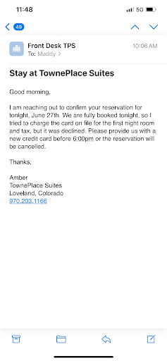 To say we are disappointed would be a gross understatement. At 10AM, our daughter received an email stating that there was an issue with the credit card on file and that she needed to contact the hotel before 6pm or her reservation - scheduled to begin that very evening - would be canceled. I called the hotel within two hours of that message, only to find her reservation had already been canceled, reassigned to someone else, and she had been moved to another hotel 15-20 minutes away. When I spoke with Katie, a TownPlace Suites employee, she informed me it was her job to cancel reservations with declined credit cards and immediately move those guests to a different hotel since they were "over booked." This was clearly a deliberate and systematic approach - despite the email indicating she had until 6pm to respond. We were never given the opportunity to understand or resolve the credit card issue before the reservation was revoked. No call, no follow-up, no chance to provide a new card number. The hotel acted without sufficient warning because of their negligence in overbooking the hotel. This is unacceptable and not the standard of service expected from a Marriott property. Guests, especially Marriott members such as myself, deserve fair communication, reasonable response time, and the assurance that their confirmed reservations will be honored. This experience reflects extremely poor management and a troubling lack of basic customer service and accountability. My husband called TownePlace Suites as well and spoke to the General Manager, Jamie, who said it is their corporate policy to transfer guests to other locations when they overbook the hotel. Guests with declined credit cards are the first to be moved, but not the last! What good is a reservation if you cannot count on it being...