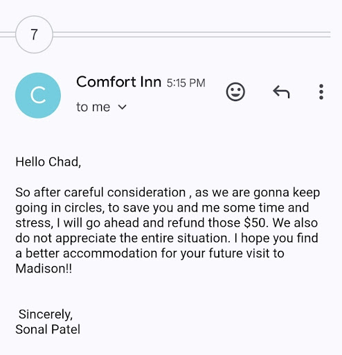 The hotel staff reviewed security footage and saw no pet. Ms. Patel then said it must’ve been a toddler — though my niece’s daughter is a teen (and taller than my niece) — not a toddler. Ms. Patel then said they must’ve brought a toddler into the room who would’ve defecated on the floor.