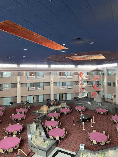 From the inside, this place was a carpeted, three-story panopticon. The sprawling open lobby showcased a player-piano fringed by dozens of red-clothed tables and black stackable banquet chairs like it was eternally prepared for Bingo Night. As decor, the tables were flanked by sprigs of plastic grass and four-foot-high fake boulders that reminded me of enormous fish tank decorations. Modern art renderings of potato peels hung from a bronze-tiled ceiling.