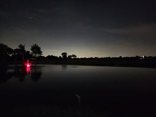 The dog park is located behind the outermost row of sites on the northeast side of the park. If you’re not in one of those sites, you can reach the park by either a narrow marked footpath that squeezes between two of those sites, or (if you’re in one of the outer sites on the other end of the park) you can reach the park by walking around the fishing lake. Or if one of those northeast sites happens to be empty, you can cut through that site like we did. It’s worth nothing that site 43 through 54 back up to a neighboring fence line, so they cannot reach the dog park from their backyards. The grass-covered dog park is fairly large and has a picnic bench for seating as well as some dog agility equipment, but it gets muddy in places when it rains, and it has no lights: a few strategically placed solar powered lights would have been helpful. There is a small wooded area behind the dog park with a short walking path if the dog park is busy or otherwise unavailable, and there’s a lot of open grassy space around the fishing lake and on the southern end of the park.