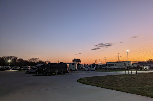 The campground is right off of Highway 6, which is a busy 6-lane road with a railroad on the other side. The nearly constant road noise, and the horns from passing trains (which I heard as early as 5am on a Sunday morning), were quite noticeable even with all our windows closed. Most of the campsites are back-ins with a few pull-throughs. All of the sites have concrete pads which are wider in the front to provide a parking spot and have grass lawns. There are no picnic tables or fire pits. The water and electric hookups are at the back of the site, while the sewer hookup is closer to the middle. Our site (site 13) was more than long enough to fit our 21-foot truck and 37-foot fifth wheel: we didn’t need to use the extra parking spot. Despite the concrete pad, our site a little un-level side-to-side, but nothing our leveling jacks couldn’t handle. There are no trees between or adjacent to the sites, but there are some trees that provide shade over the picnic area next to the fishing lake.
