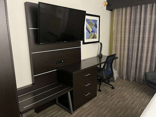 My Husband and I stayed at this Holiday Express because it was near our neighborhood and when a severe storm moved into the area, we decided to get a hotel for a couple days to get out of the weather and off our boat. We had other choices but opted for The Holiday Express on Shoreline Highway. We were greeted instantly upon entering the front door by friendly, welcoming smiling faces and a plate of freshly baked cookies. Our needs were met completely and eagerly by each member of the staff from reception, front desk agent(s), Front Desk manager (Rolando) General Manager, Luis, Maintenance and Housekeeping. I was given flowers by Guest Service Agent Joanne, as we connected instantly and she felt I'd enjoy the Callalilies she had brought from an event. The room was convenient, clean and had a comfortable back patio in which 2 of us sat comfortably. The room temperature was adjustable to our satisfaction.