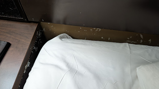 Cons: Confirming the reservation was difficult. The first person I spoke to didn't know what to do when I asked if they could confirm my reservation. C'mon. They didn't ask for ID at check-in. Sure, who is going to have my name and try to steal my room, but something about that felt insecure. There was a lot of trash kicking around outside, including a vibrant, Giants orange beanie that could not be missed. No one is picking up outside and I assume they are not maintaining a lost and found. Just based on the unkempt premises, I was slightly concerned about leaving my car unattended. The room was extremely hot and humid upon entry. They had left the front window open and the HVAC unit switched off. The HVAC unit was effective, but it ran continuously the entire time we were there. When it was not actively cooling, it seemed to switch into fan mode. It also made occasional popping and clanging noises in the night. There was too much furniture for the room. Dresser drawers could not be opened because they were up against the HVAC unit. The desk and cair obstructed the ability to walk around the bed. The recessed overhead lighting did not work (except one bulb) and one of the bedside drawers was broken. No shampoo in the bathroom. The dispenser had been removed from the wall. The bathroom sink was slow-draining and the faucet in the tub was difficult to turn fully off. I basically punched that thing in the face to make it stop running. I have never stayed in a room that was so dirty. The more I looked, the more marks and stains I noticed on the walls, the floor, the ceiling, the furniture... No comforter on the bed, no extra blankets or pillows, and the sheet straight did not fit the bed. That was by far the strangest thing for me. It came untucked at the upper corner and there wasn't enough slack to tuck it under. On closer inspection, it was not properly tucked at either end, nor could it be. The mattress pad was also not tucked under the corners of the mattress. It felt stupid to try to calling the front desk; if they were able to do it properly, they would already have done, so I just fixed the mattress pad and called it good. No "do not disturb" sign was provided. Around 10:30 AM, cleaning staff tapped on the door and then immediately tried to enter, hitting the dead bolt. I yelled and they closed it again and walked...