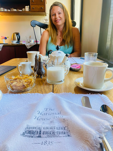 My husband surprised me with a two night stay at National House Inn. I had practically grown up in Marshall spending lots of summers and holiday school vacations with my grandparents in Marshall in the country. The highlight of the vacations was going into Marshall with my Grandma to go shopping and walk around the town. The town still does not disappoint and neither did the inn. || We stayed in the Charles Dickey room which has a queen bed, electric fireplace and full ensuite bathroom. Both nights were pleasant sleeping nights and though we were on the roadside, it didn't matter to me as most evenings we were out until 9pm and by the time we got back to the room traffic had pretty much quieted down. There are blinds on the windows with thick curtains to close to keep out the light from the streetlamps. || Breakfast was good. We had crustless quiche, fresh fruit, fresh pastry, toast, waffles (could have blueberries or whipped cream or both). Coffee was good. And pleasant conversation with the other guests and innkeeper. They also have an afternoon tea with biscotti which we didn't partake of while we were there.|| Debbie, the innkeeper when we checked in was able to make us a reservation at Shulers Restaurant which was just a short 7-10 minute walk away. When we got back to our room before dinner the innkeeper had left us two wine glasses and a bottle of champagne to celebrate our anniversary with some fresh picked flowers that was a very pleasant surprise. || Loving old historic places as I do it was great to see the big beams in the inn and to be able to wander around the inside and see the other rooms as long as they were not currently being used. Actually it was a great way to pick out what room we want to stay in next time since we will definitely be back!! || National House Inn is a jewel in Marshall and in Michigan. You can feel the history in the inn and I joked with my husband at one point walking through the halls and parlor on the second floor that the original owners had kids, those kids would never have been able to sneak around. If you are looking for a modern looking B & B, don't look here. This Inn was built in 1835 and the innkeepers do a great job of welcoming you and making your stay...