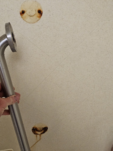 While she was doing that we went ahead and took showers with what we had and made due. While I was takeing a shower the grab handle was rusted off and was just hanging there. I have a artificial leg and sometimes need the handle to move around. So after my shower I went back to find the girl and let her know about the handle. While I was going to the front she showed up at the room with the bedding and towels and my wife showed her the handle issue. So she decided to move us to a new room and take some money off the bill. She was apologizing and vary unhappy with the issues we were having. We got the new room 2 doors down and we just went to bed because we are exhausted at this point.
