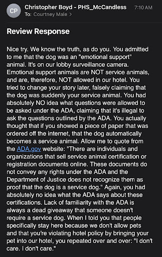 If I could leave negative stars for service I would. To start- When we arrived there was a homeless man loitering in the lobby and out front and the lady at the front desk told us to watch for him as she thought he came from the bus stop and was lingering around the grounds. ||||100% not worth the price. We are originally from this area and come back every month or two and always stay at Marriott hotel of some sort because we Silver lifetime status and have never had such a terrible experience as this. We always stay in cranberry but decided to try this location in mccandless as it was closer to a few places we were visiting to change it up a bit. Highly recommend ANY other hotel in the area. The tvs were tiny and just sitting on the desk, room tiny itself and very dated, terrible upkeep. Cannot tell this is a newer property. ||||The largest issue was from the customer service “manager”. I have never been so offended and felt so disrespected by someone in customer service yet with a supposed manager title. This hotel is 10000% not animal friendly even if your animal is a service animal and you have certified paper work to provide such because he would not even look at it. We were asked directly by said manager (After checking in with ZERO issue the night prior with pleasant lady working the front) and I quote: “Are you disabled?!” Yelling at me when coming in the lobby from taking our service dog out first thing in the morning. This caught me incredibly off-guard as you can imagine. To which I replied “why do I look disabled??” . He said pets weren’t allowed and asked our room number to which we gave him. And advised we checked in last night with him without issue and he said “well I wasn’t here last night”. Dumfounded- We went back up to our room in shock. We were going to request late checkout and I went back down to the desk to discuss further and bring the documentation down for my dog in an effort to settle things. Very long story short I have never been so offended in my entire life with him arguing in front of everyone in the lobby calling me a liar and refusing to look at any documentation. Waving a paper in my face that he had ada regulations and wanted me to recite them to him saying I didn’t know the laws. He was so degrading waving the paper in my face but would not actually show me said written policy. Much more was exchanged but to be disrespected and labeled as disabled and in front of a lobby of people and families eating breakfast was humiliating. I have the entire interaction on video and when I rewatch I am appalled by this man’s behavior. I literally had just gotten off a flight with my service animal, and stayed at several other hotels (that do not allow pets) without any issue at all. He was on his leash, and did not make a peep or any other indication that he was not trained to be there as a certified service animal. ||||He even took it a step further when we checked out ripped the keys from our hands saying nothing and proceeded to charge us a “pet fee” for the room. For $35. For a whopping $35 this man felt the need to treat us in such a disrespectful ignorant way. I would’ve given him the $35 since that was clearly his only concern. This is embarrassing that a Marriott franchise would make a discriminating man like this a manager to be the face of customer...