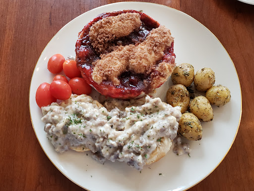 The best part? The absolutely scrumptious breakfast that awaited our entrance to the dining room (and those long green curtains are the bomb!). Breakfast consisted of homemade biscuits and gravy, new golden potatoes, cherry tomatoes, and a piping hot cherry tartlet.