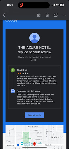 Edit: Well 5 days later, I've heard nothing and seen nothing from The Azure hotel. Seems like their wish to do right is as much lipservice and hot air as everything else there. I'm so sorry I ever went to bat for you all and put my voice behind attempting to spendba night there... im so saddened that this is how the hotel and hospitality industry has chosen to...