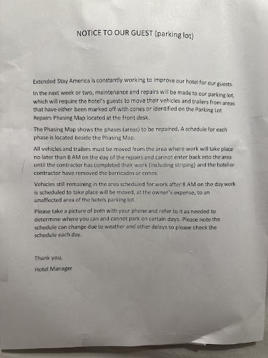 Five months into staying here dealing with incompetent and rude staff, filthy facilities, nasty linen (so we washed ourselves), horrible service (so we cleaned our room ourselves) and bad management, we finally experienced the unthinkable. To explain, out of the blue they decided to repave the parking lot without letting guests know and started towing all cars. We had just been discharged from the hospital and woke up next morning to not find our car. The manager said it was something last minute and they had little time to organize but they had posted notices around the hotel. We walked the entire hotel and found only one paper facing the inside of a building column which had only been posted the previous day they began work according to other guests, paper had vague information, no specific dates and no map with phases anywhere to be found. (See attached image). The correct procedure would have been to leave a notice on each and every door with enough anticipation and specific details for proper accommodations to be made.