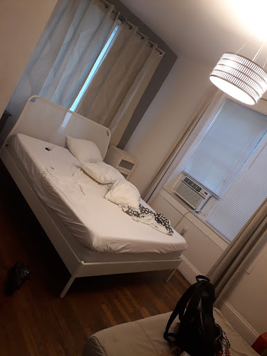 When we first arrived, we realized our mistake. Instead of the off-street parking promised in the listing, we were forced to park on the street and weren't entirely sure of the safety of this, given the surrounding area. Furthermore, instead of the bright, airy, CLEAN room shown in the listing, we were led to a 1st floor room at the back of the building, down a filthy hallway with dead roaches that looked like it hadn't been cleaned in at least a month. We have never found the pictures on HomeAway to be so misleading ... instead of 3 windows ... 1 in the "kitchen" and 2 in the main area, there was one dingy window in the main area with bars covering it overlooking an alley. The room itself was disgusting, from the stained sofa to the crumbs throughout the fridge, filthy countertops, and the floors that turned our feet black after only a short time. I have pictures of it all, even the airline ticket stub left behind on the floor by the previous occupant. I would be surprised if our room had even received a cursory cleaning between their departure and our arrival. The "amenities" included a half roll of toilet paper, no paper towels, a ratty sponge, 2 threadbare towels, a broken bedside lamp, and a mattress from the mid-60s that was as hard as a rock. The "fully stocked" kitchen included some junky cutlery (2 place settings and some misc. spoons), some thrift store dishes (again, for two) and bombed out pots and pans.