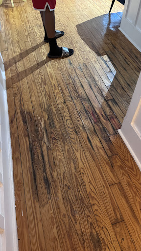 As soon as we walked into the yellow building where the rooms are, we noticed severe water damage throughout the entrance floor. The wood was badly damaged — sunken in and uneven to the point where it shifted under your feet when you stepped on it, which didn’t feel safe at all. When we got to our room, it was more of the same. The entire space felt dirty the second we walked in. The walls were covered in scuffs, scratches, and old stains that looked like they hadn’t been painted or properly cleaned in years. The wood floors were beat up, scratched, and stained with what looked like water spots and grime. The furniture, including the chair, had visible dark stains, and the bed frame looked worn and dirty. Even the corners of the room and edges of the floor had built-up dirt and dust, like they hadn’t been touched in forever.