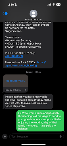 However, I have never been so frustrated with a hotel than with the phone call I received around 11am on the day of the wedding, while I was in the makeup chair getting ready with the bride. The hotel staff called to tell me that the card on file didn't work and that they had sent me a text to get it updated earlier in the week. This was indeed true, I had just missed it as it was buried in a general-sounding welcome text, and a flurry of many other emails from the DD, and I hadn't caught that sentence. Honest mistake. The caller was so incredibly rude and insisted that I pay right away. Then they immediately followed up with a text message that threatened to turn off our access code if the room wasnât paid in full immediately. This is after the first/only notice, and I was treated like a scammer. In the middle of a happy occasion with friends and family. I was outdone. Of course I immediately paid the balance, but I certainly expect more hospitality when spending over $1000 on accommodations. A simple email with a bold header noting that updated payment info was needed could have helped in this situation, not burying it in a text along with lots of other info (and also sending multiple emails, at some point one assumes all the info is redundant).