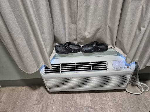 June 20, 2025: Kevin was Great. From there, it went down a steep slope. Before bringing in our luggage, we have learned to inspect the room. We discovered a king bed with very damp comforter, sheets, pillow cases, pillows, and after walking out of the tiny bathroom, discovering water on the vinyl plank flooring coming from under the flooring. As I headed to the tiny office, I met Kevin, bringing my wife's drivers license to her. With my expression, Kevin asked if all was OK. Kevin, you need to see all of this. He did. He was FRUSTRATED and without words except about the "They" people. They told me this was repaired. He took us to a (two bed) room. OK. ALL the rooms, the outside walkway, the cubby where the ice machine is located ALL smelled Rank of those tiny, nasty, flavored cigars and flavored vaps. Nauseous. Kevin sprayed something, but it did not work. The wetroom smelled Very musty. I am 5'10 and 190 pounds. The space for the toilet fits a three or four year old. The bathtub floor was as slick as Teflon and NO grab handles inside the shower stall. We expected their advertised breakfast, which turned out to be pastries only. We are both T1 Diabetic and my wife is life-long Celiac. Sad. The rooms all have a step up / step down at the entrance door, so Be Careful. It's definitely a trip and fall hazard. The curtains hang out past the vents of the heat and air unit. I could go on, but I am tired. No return...
