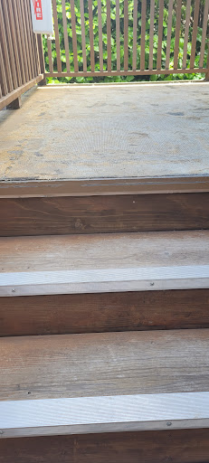 We get checked in & walk up to our room. The pictures have a nice stone area in front of the rooms...the area infront of our rooms looked like they just pulled up some carpet...dirty & very unappealing (see pictures). There was also trash on the stairs. We walk into our room & it STINKS! Odd combination of cleaners I'd assume. The bed is not even (the foot of the bed is slightly higher than the head) and only two of the 4 (small pillows...not king sized to fit the bed) had pillowcases. The other two were just the pillows so who knows what was on them. The bathroom door was also scratched & dirty (see pic) and was very difficult to close.