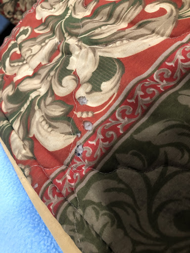 Finally open our room and at face value, it looks okay. Not as powerful of a pinesol smell but then we started checking things. The particle board headboard was falling off, chipped drywall, patched paint, stained bedspread and sheets, and the best - a ton of eggs and dead bed bugs on the bottom bed protector. Yeah - whatās being protected?