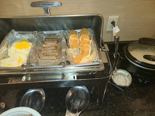 Breakfast was amazing: Belgian waffles (both blueberry and regular), biscuits and sausage gravy, scrambled egg patties, hard boiled eggs, sausage patties, bagels, English muffins, dry cereal, oatmeal with toppings, donuts and breakfast muffins, fresh fruit (pears, apples, oranges, bananas), yogurt, juice, hot chocolate, coffee and tea. It was roomy, had plenty of seating and was very, very clean. The attendant, Casey, was constantly wiping things up and making sure everything was refilled. It was perfect.
