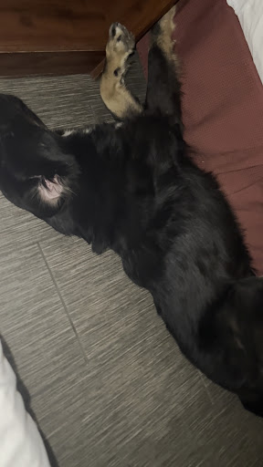 Dominating the room was a bed that might've been the handiwork of celestial beings. Dressed in fabrics that whispered of moonlit nights and ethereal dreams, it cradled its occupants in a realm where weariness was but a distant echo. And for Rollo, he found comfort sleeping soundly beside the bed, where dreams of heroic deeds and vast plains awaited.